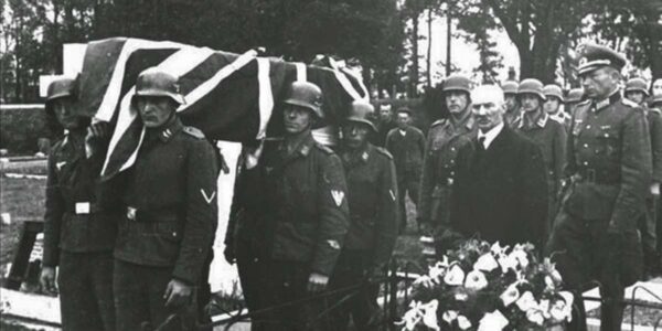 An RAF airman is buried with full military honors by occupying German soldiers, 1943. Full military honors were granted by the Luftwaffe at the funerals of RAF sergeants Butlin and Holden who were shot down over Jersey, Channel Islands. It…