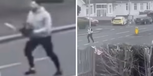 Chilling moment man brandishing a chainsaw chases cop in UK street horror
