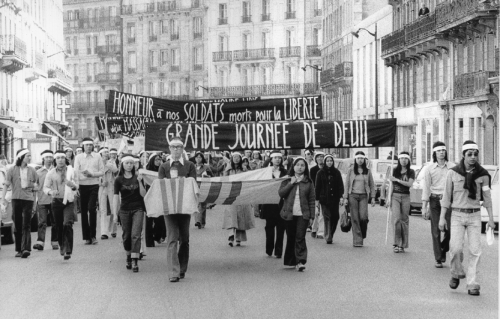 Trên đây là một tấm ảnh rất cảm động ghi lại cuộc biểu tình của SV Việt Nam tại Paris ngày 27/4/75, ba ngày trước khi Saigon sụp đổ. Lúc đó trong nước chúng ta vẫn chưa biết Đất Nước sẽ đi về đâu, nhưng tại Âu châu, nhất là tại Pháp mọi người đã biết số phận của VNCH. Các bạn SV Việt Nam đều đã để tang cho một Dân Tộc, một Đất Nước, lá Đại kỳ VNCH đã được rước đi khắp quận 13, thành phố Paris. Tấm ảnh được scan lại từ một tờ báo Pháp, tháng 4 năm 1975.