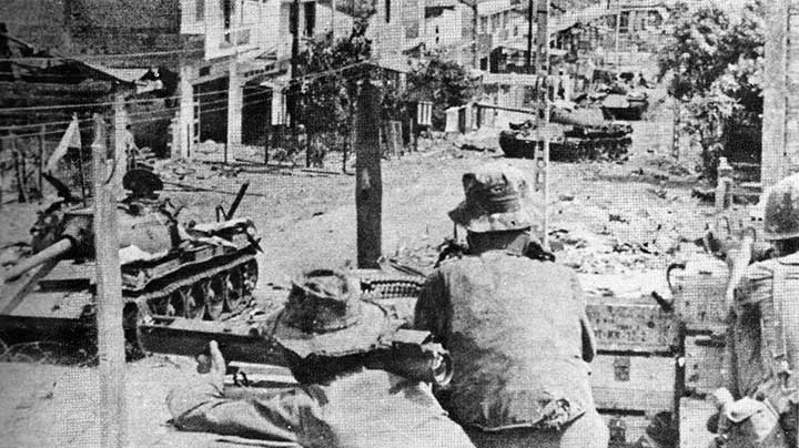 Xe tăng Cộng quân rú gầm nhiều nơi trong thành phố, chạy ngang chạy dọc, tiếng xích sắt ken két nghiến trên đường tráng nhựa hoà lẫn với tiếng nổ ì ầm bắn ra từ đại bác 100 ly trên pháo tháp nhắm vào các cao ốc, và những bức tường nhà hiển hiện trên hướng tiến của chúng.