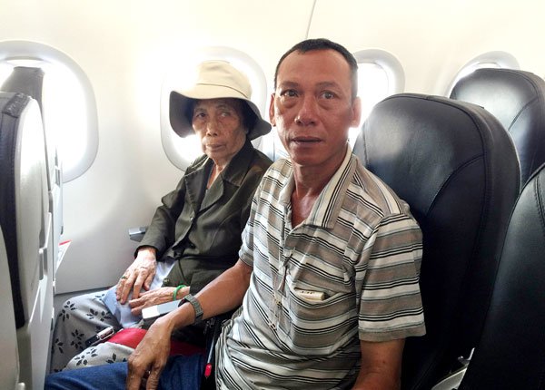 Bà quả phụ Nguyễn Văn Ðương và con trai Nguyễn Viết Xa lần đầu tiên trong đời đi máy bay. (Hình: Việt Hùng/Người Việt)