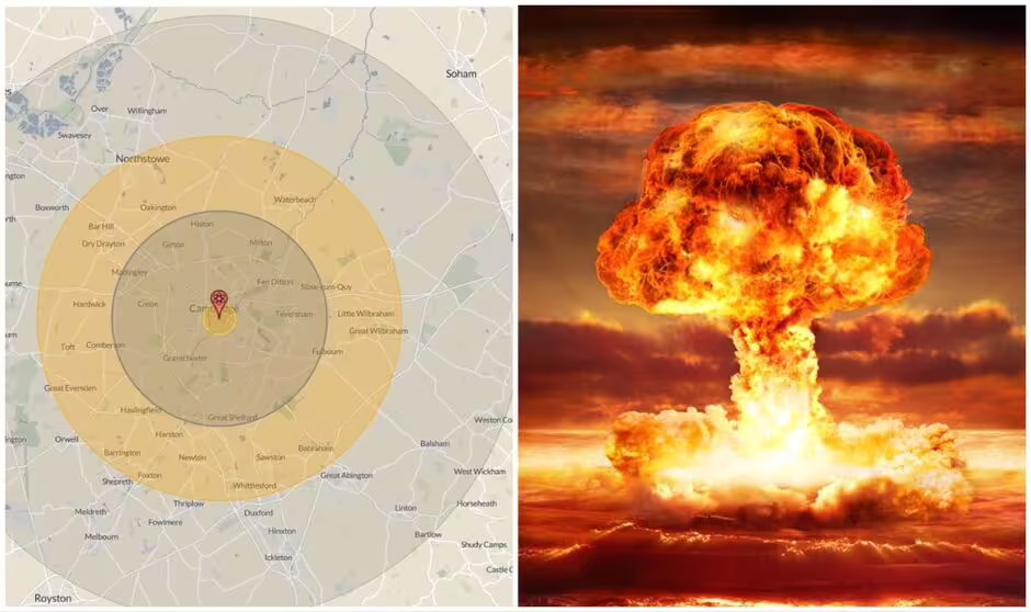 The nuclear fireball would cover a radius of 2.97km squared, which is central Cambridge including the suburbs of Grantchester, Milton and Teversham and it includes Cambridge University’s main campus. Nuke Map states: “Maximum size of the nuclear fireball; relevance to damage on the ground depends on the height of detonation. If it touches the ground, the amount of radioactive fallout is significantly increased. Anything inside the fireball is effectively vaporised.”