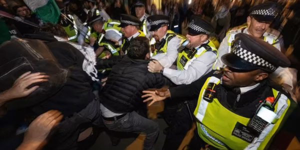 Violent clashes broke out between pro-Palestinian protesters and police outside the gates of Downing Street this evening just hours after a terror attack at a Manchester synagogue. Thousands of people waving Palestinian flags gathered in central London on the same day two…