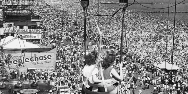 Sunbathers and swimmers on the beach while a blimp with the word Flamingo on the side glides above. For e brief time, early in the twentieth century, Coney Island was the most dazzling spectacle in the world — a wonderland…