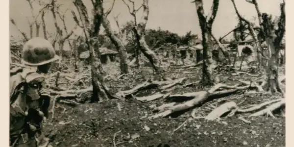 14/6/1965 TIẾP THEO TRẬN CHIẾN–Những thân cây và cành bị cắt cụt là cảnh nổi bật tại Thuận Lợi, một thị trấn đồn điền cao su ở phía bắc Đồng Xoài, khi một đại đội Biệt Động Quân tiến vào…
