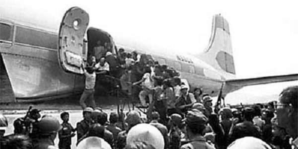 Chân một ngươi lính VNCH còn trong bộ phận hạ cánh của chiếc World Airways 727 và cánh trái của phi cơ hư hại vì lựu đạn của lính VNCH nhưng vẫn rời Đà Nẵng. Nguồn: UPI Bấm vào hình…