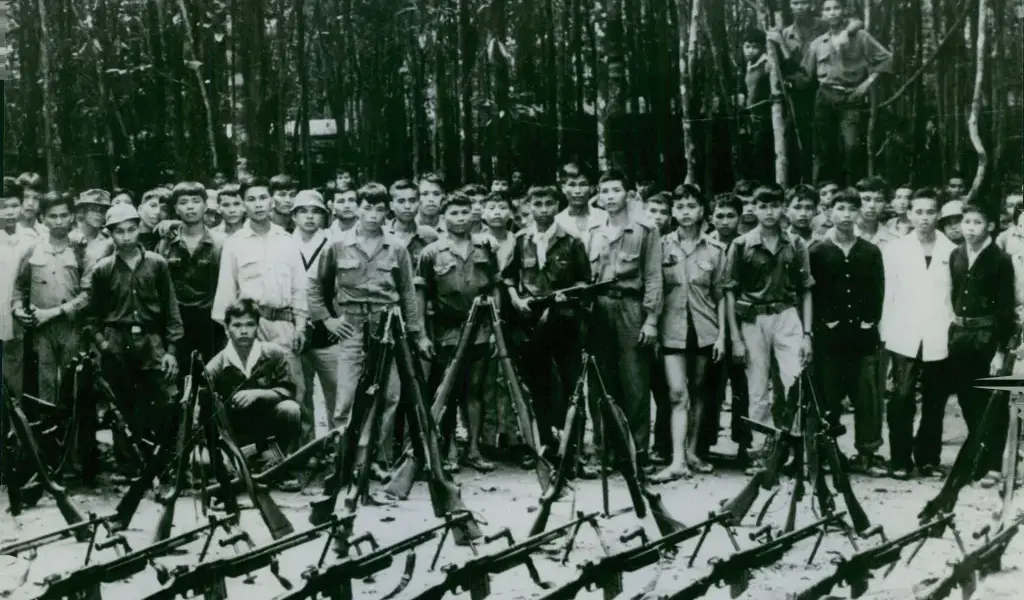 Lực lượng Giải phóng biểu dương lực lượng với các vũ khí thu được từ đối phương tại một căn cứ trong rừng, 1964.