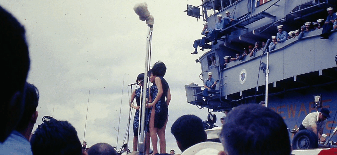 Nhóm Korean Kittens trong một buổi biểu diễn ở tàu sân bay USS Bennington thời chiến tranh Việt Nam. Hoạt động này được tổ chức bởi USO Show (United Service Organizations) – một chương trình biểu diễn phi lợi nhuận phục vụ quân đội Mỹ có lịch sử lâu đời.