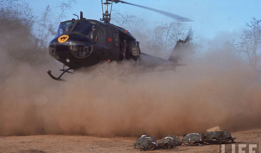 Chiếc phi cơ tải thương hạ thẳng xuống, máy quạt sàn sạt bốc bụi, một phi công chạy nhanh vào hào chúng tôi gọi to :