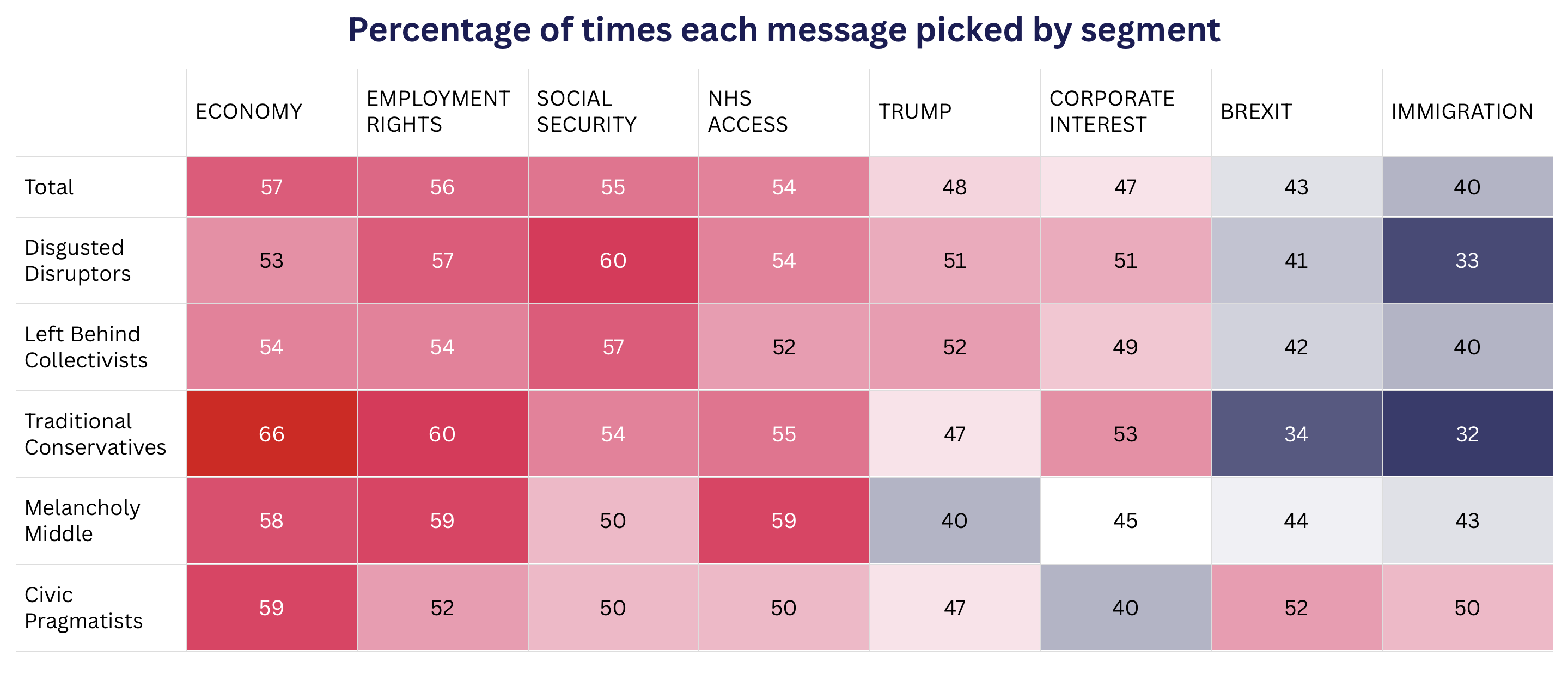Crucially, the polling published today found slight variations among Reform’s least committed supporters. 3 in 5 (59%) of the Melancholy Middle, who represent a fifth of all prospective Reform UK voters, were most convinced by criticisms tied to Farage’s plans for the NHS (59%) and his voting against greater employment rights (59%). Civic Pragmatists meanwhile, also representing a fifth of all Farage’s support, were most convinced by the economy (59%), employment rights (52%) and reminders of Nigel Farage’s role in Brexit (52%), estimated to have wiped 4% from UK GDP.