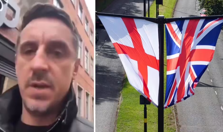 Gary Neville has been accused of “kicking down at the working class” after blasting “angry middle-aged white men” for hoisting Union Flags. The former England defender and now TV pundit suggested following a deadly terrorist attack at a Manchester synagogue last week that people putting up the flags “know what they are doing”, using them “in a negative fashion”. They are “turning Brits against each other”, the Sky Sports host added, also saying that he had taken one down from a construction site of his in Manchester.