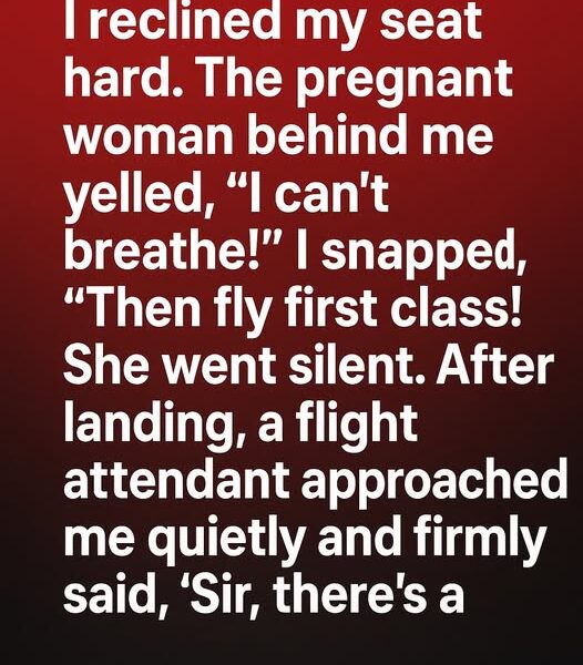 I once reclined my airplane seat without thinking, eager to relax after a long week. Moments later, the pregnant woman behind me quietly whispered that she was having trouble breathing. Annoyed and tired, I responded carelessly, believing comfort was something you earned. She didn’t reply, only sat quietly, hands resting gently over her belly. The rest of the flight felt ordinary, yet a little tension lingered in the air.