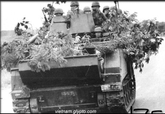 Chúng tôi bay về hướng Gò Vấp, tôi biểu Cơ lấy cao ðộ. Xa xa phía dưới, tôi thấy những ðoàn quân xa chở ðầy quân, những chiến xa, những pháo kéo của quân cộng sản BV như những con rắn dài trên xa lộ Biên Hòa và trên Quốc Lộ 13 bò vô Sài Gòn. Hai trực thãng của chúng tôi ðáp xuống trại Phủ Ðổng nõi ðặt BCH TGB và BTL/Quân Ðoàn III. Tôi vội ði vào vãn phòng tìm sĩ quan trực. Tôi thấy các nhân viên vãn phòng chạy qua lại nhớn nhác. Tôi không gặp một ai có thẩm quyền, chỉ có 1 Trung Úy mang huy hiệu Quân Ðoàn III, tôi nói tôi muốn sử dụng ðiện thoại ðể liên lạc với BTL Biệt Khu Thủ Ðô báo cho họ biết gấp các cánh quân của tôi sắp về tới cửa ngõ Bắc Sài Gòn ðể tránh bắn lầm nhau. Tôi gọi nhiều lần, gọi một cách tuyệt vọng, không có ai ở ðፊ ??u máy trả lời. Rồi tôi gọi Trung Tâm Hành Quân Bộ Tổng Tham Mưu, cũng không liên lạc ðưýợc. Lúc bấy giờ tôi nghe nhiều loạt ðạn pháo binh ðịch nổ ở hýớng sân bay TSN. Giờ này, các cánh quân Thiết Giáp của tôi cũng vừa ðến Bình Triệu gần khu nhà thờ Fatima.