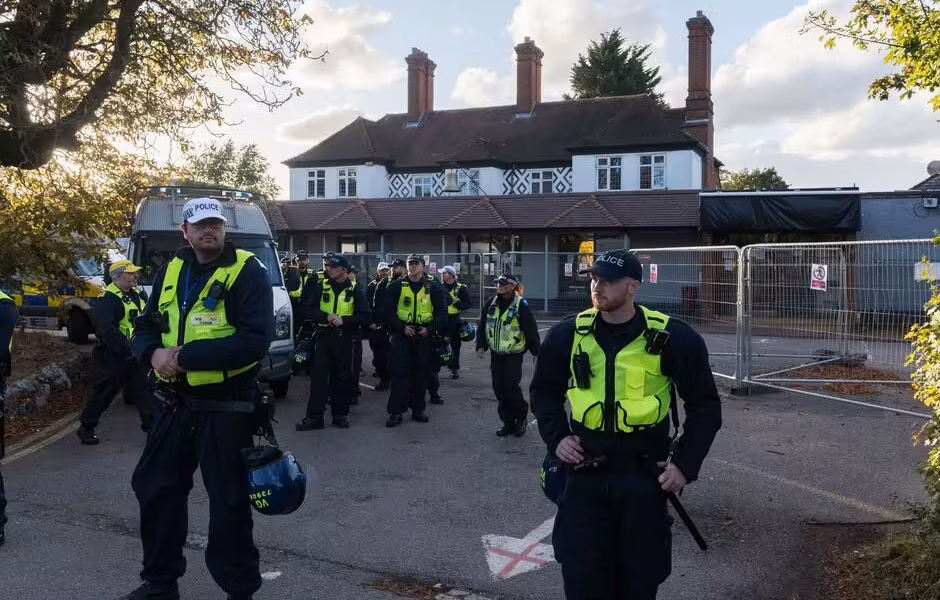 EPPING, UNITED KINGDOM – AUGUST 31: Police officers stand outside The Bell Hotel during a protest ag (Image: Anadolu via Getty Images)