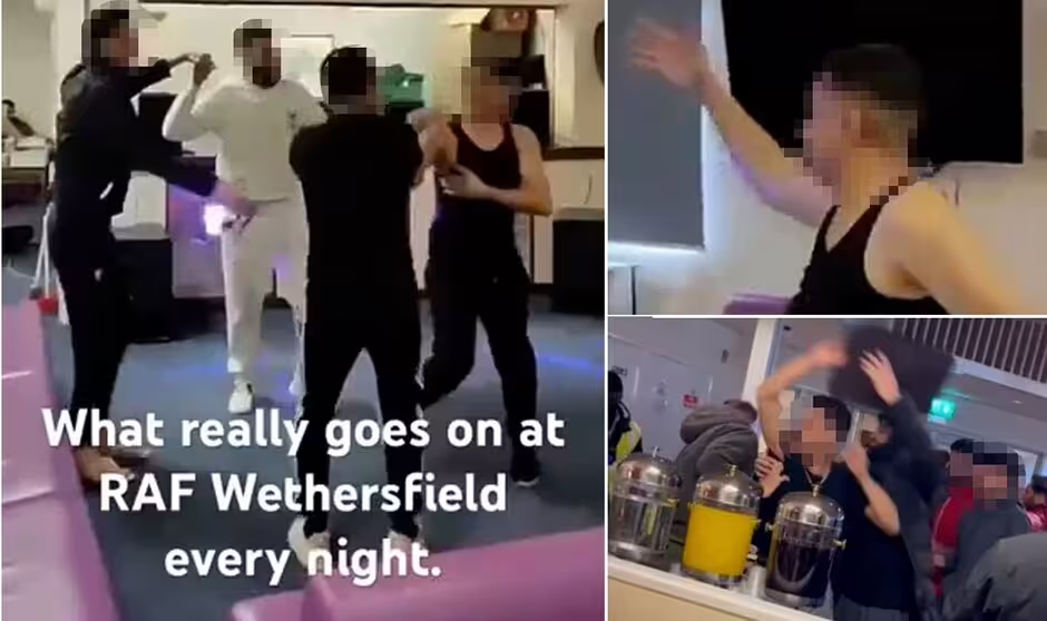 Groups of male asylum seekers were filmed singing and dancing in a common room at RAF Wethersfield in Essex, complete with a disco ball and glittering lights.