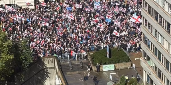 A group taking part in yesterday’s Unite the Kingdom rally, organised by Tommy Robinson, are seen in a clip breaking into the grounds of a London hospital and “peeing in the bushes”. More than 100,000 people crammed into central London for a march…