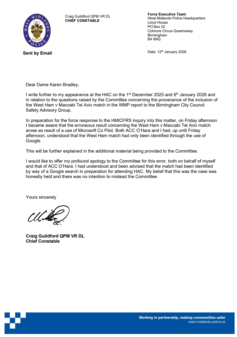 “His Majesty’s Chief Inspector of Constabulary has written a letter to the Home Secretary to set out his ‘preliminary views’, in relation to the match assessment and categorisation carried out by West Midlands Police around the Maccabi Tel Aviv vs Aston Villa fixture on November 6 2025.