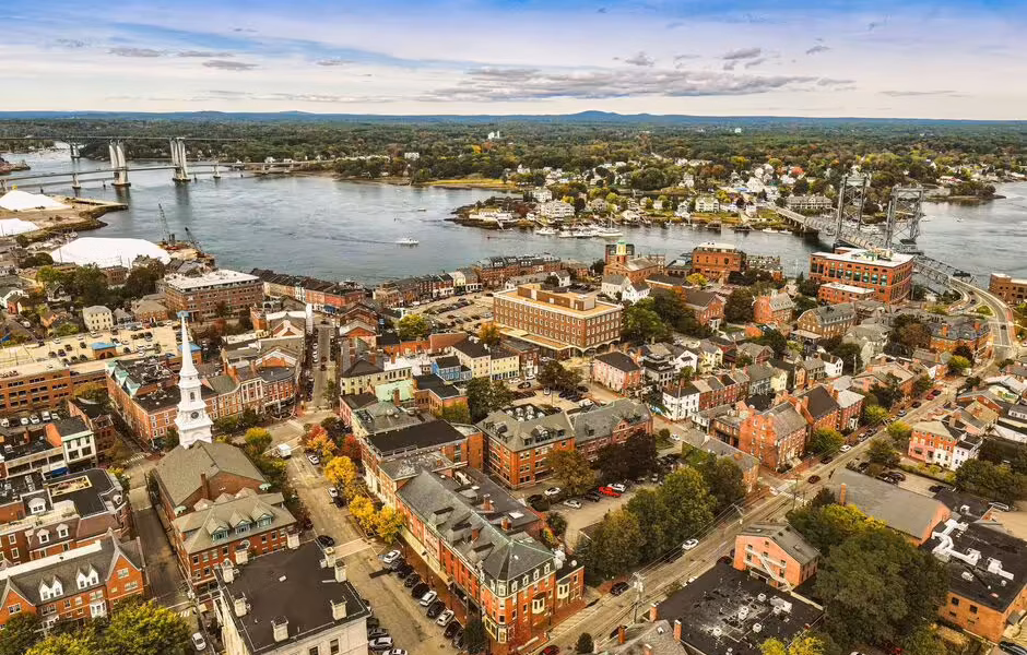 Aerial view of historic buildings around Downtown Portsmouth in New Hampshire in the fall