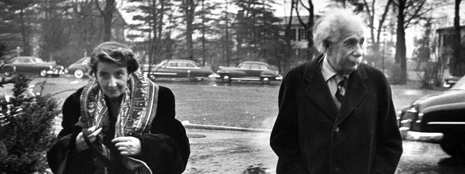 Albert Einstein with Mrs. Valentine Bargmann outside his home in Princeton, NJ, March 14, 1953. (Photo by Esther Bubley).