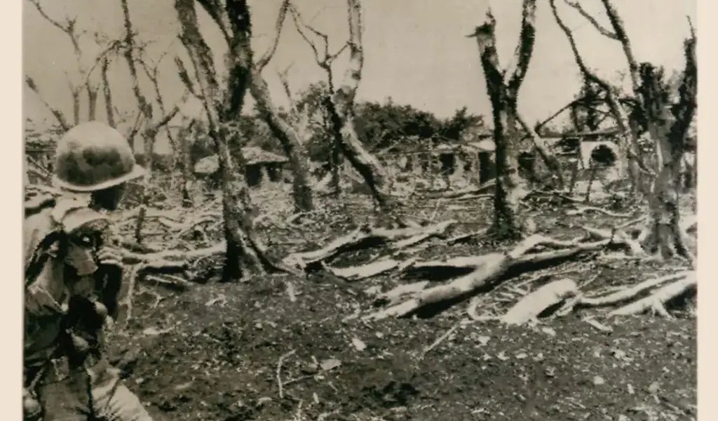14/6/1965 TIẾP THEO TRẬN CHIẾN–Những thân cây và cành bị cắt cụt là cảnh nổi bật tại Thuận Lợi, một thị trấn đồn điền cao su ở phía bắc Đồng Xoài, khi một đại đội Biệt Động Quân tiến vào khu vực này ngày hôm nay. Thị trấn đã bị phi cơ Mỹ dội bom hôm Chủ nhật sau khi VC phục kích một tiểu đoàn quân Nhảy Dù Nam VN tại đó hôm thứ bảy. Một ít binh sĩ Dù bị thương đã được tìm thấy. Thị trấn này đã bị phá hủy hoàn toàn. (AP Wirephoto by radio from Saigon)
