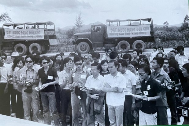 Vào mùa hè năm 1973, Bộ Dân Vận và Chiêu Hồi của chính quyền Việt Nam Cộng Hoà tổ chức một cuộc viếng thăm quê nhà cho hàng ngàn sinh viên du học và người Việt xa xứ. “Đại Lộ Kinh Hoàng” tại tỉnh Quảng Trị là một trong những địa điểm các du học sinh thăm viếng. Hình trên, Thanh Hùng, một sinh viên trong nước (thứ ba từ phải) hướng dẫn đoàn, đang chuẩn bị đọc văn tế các nạn nhân bỏ mình trên ĐLKH tại nghĩa trang nơi chôn cất 1.841 dân thường. Nghĩa trang này nay đã khôgn còn dấu vết, nhưng Đài Đức Địa Tạng do tiền đóng góp của dân Miền Nam gửi tới nhật báo Sóng Thần xây dựng nên, hiện vẫn còn tồn tại. (Ảnh Trần Đại Lộc, tư liệu của Phạm Phú Minh)
