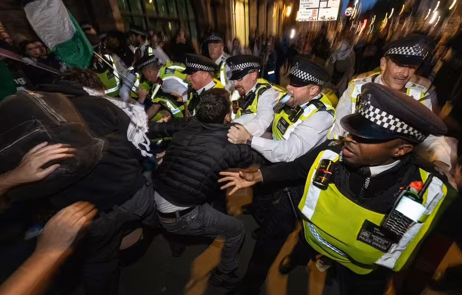 Violent clashes broke out between pro-Palestinian protesters and police outside the gates of Downing Street this evening just hours after a terror attack at a Manchester synagogue.
